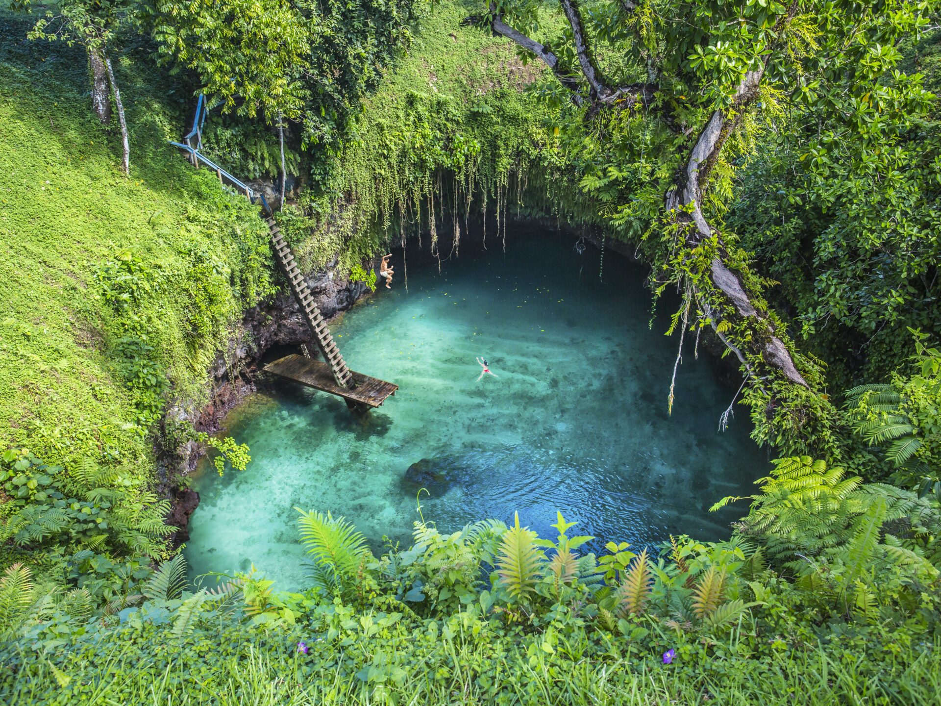 Ein tiefblauer Naturpool mitten im Grünen, erreichbar über eine lange Holzleiter. Kein Action-Spot, sondern ein stiller, fast ehrfürchtiger Ort, der zeigt, wie kraftvoll Samoas Natur ist.