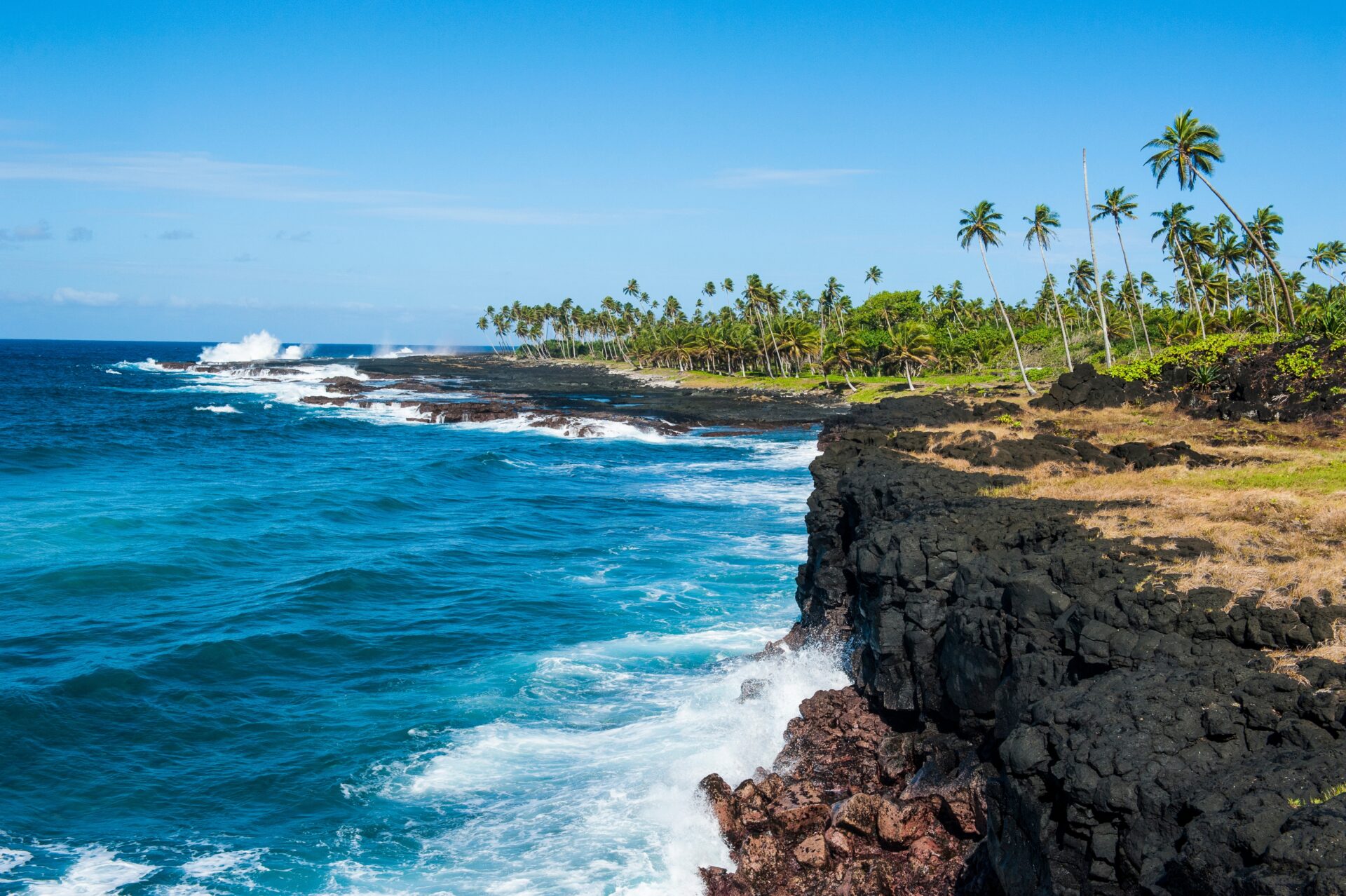 Hier zeigt sich Samoa von seiner kraftvollen Seite. Das Meer drückt durch schwarze Lavakanäle und bricht mit beeindruckender Wucht nach oben, begleitet von Wind und Gischt. Kein Ort zum Verweilen, sondern zum Innehalten und Staunen über die rohe Energie der Insel.